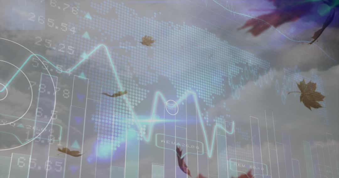 Digital representation of global financial data overlaid with falling leaves and cloudy sky. Abstract animation blends nature with data analytics, perfect for presentations and reports on environmental finance, globalization effects, or technology advancements. Ideal for use in financial technology contexts, providing an intriguing contrast between natural elements and digital data visuals.