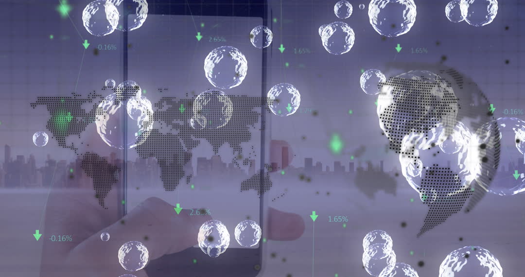 Digital concept depicts a hand holding a smartphone amidst animated bubbles, a world map, and a glowing globe. Illustrates themes of global finance, technology advancement, and economic dealings. Ideal for use in presentations about technical progress, international markets, online business models, or innovative networking ideas.
