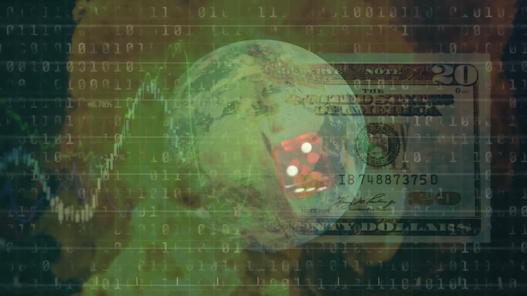 This conceptual video combines elements of global finances, featuring a planet Earth doubled up with red dice overlaying a background of a US dollar bill. The presence of binary code hints at digital data processing named within financial systems, while the faint fire videos communicate volatility or risk within financial markets, thus making usage in niche blog posts highlighting economic trends, stock photography in finance-focused magazines or publications on pertaining fintech forecasting issues possible.
