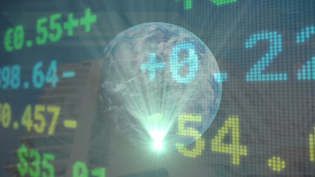 Depicting a rotating globe overlayed with fluctuating financial data, highlighting interconnectedness of global economies and markets. Symbolizes digital economy and technological innovation. Great for illustrating concepts of globalization, financial technology, economic news, or technological advancements.