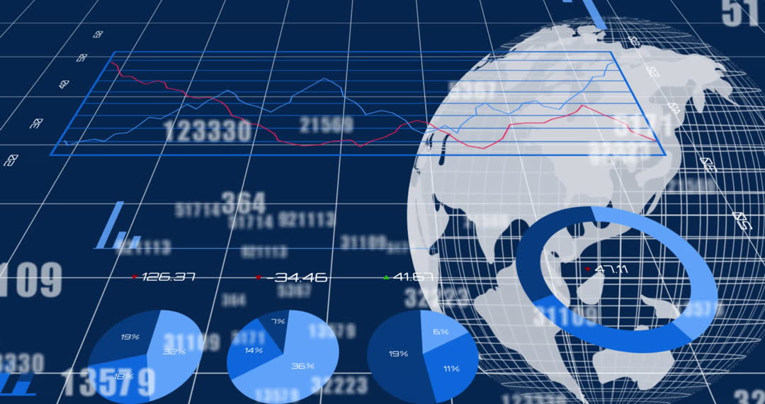 Visual depicting global financial data processing over a digital blue background integrates globe and graphs. Suitable for illustrating modern business analytics, finance technology, stock market reports, and financial consulting services.