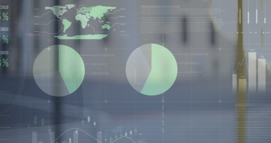 Visual features animated depictions of financial data analytics with world maps and various charts. Incorporates digital elements to demonstrate global connectivity and financial insights. Useful for illustrating modern business operations, digital finance presentations, and global commerce themes.