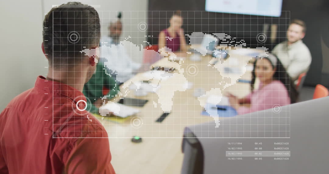 Diverse group of business professionals engaged in a meeting within a modern office, with digital world map overlay representing global financial data analysis. This scenario illustrates technology use in corporate settings and international business strategies, suitable for content on global commerce, data analytics in finance, or promoting teamwork in technological environments.