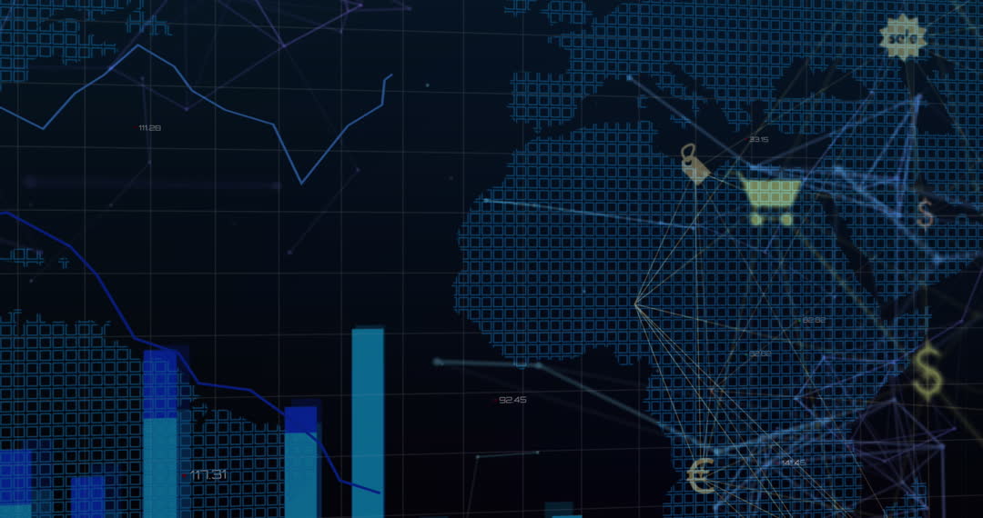 Abstract digital animation showcasing global financial data processing and economic charts. Visual elements include a red grid overlay, emphasizing economic trends and analytics. Suitable for illustrating concepts of digital finance, stock market trends, and economic data visualization in presentations or media designs focusing on financial technology and global economics.