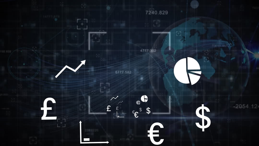 Illustration shows dynamic data symbols and currencies overlaying digital globe. Useful for themes involving financial technology, data-driven insights, or global economic analysis presentations.