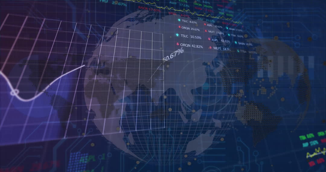 This visually striking digital composition shows animated financial data and a world map over a navy backdrop. Such videory is ideal for presentations on global economic trends, technology in finance, or discussions on international trade and investment strategies. Perfect for use in business reports, fintech advertisements, or educational materials about global markets.