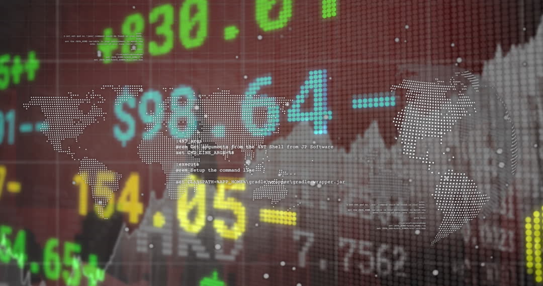 Illustrating global financial data, this animated graphic features stock market figures overlaying a digital world map. Useful for presentations or videos about international finance, economic trends, or the impact of technology on the global economy.