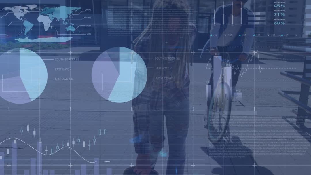 Dynamic visualization of global financial data with overlaying graphics blending with diverse professionals engaged in modern digital activities. Highlights technology integration in financial analysis. Ideal for use in presentations, online content about finance technology, global markets, economic trends, and the role of digital tools in financial sectors.