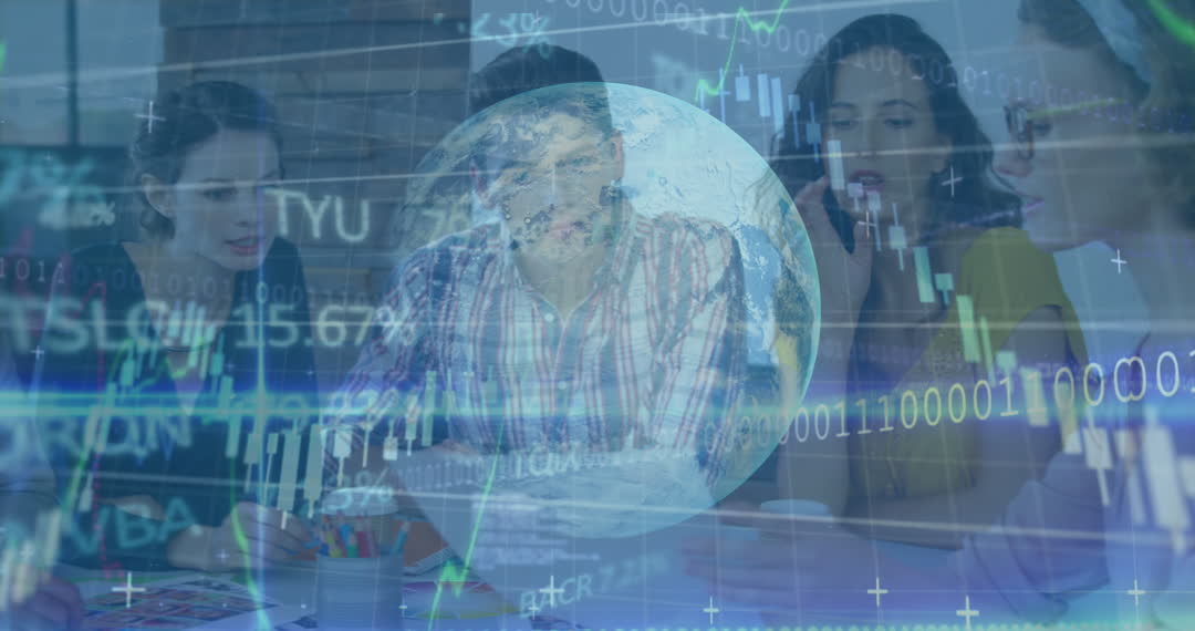 Business team appearing through overlay of a globe with financial data, symbolizing global connectivity. Concepts like collaborative financial planning, international marketing strategy, and technological integration are implied. Useful for business presentations, articles on global finance, or stock market educational content.