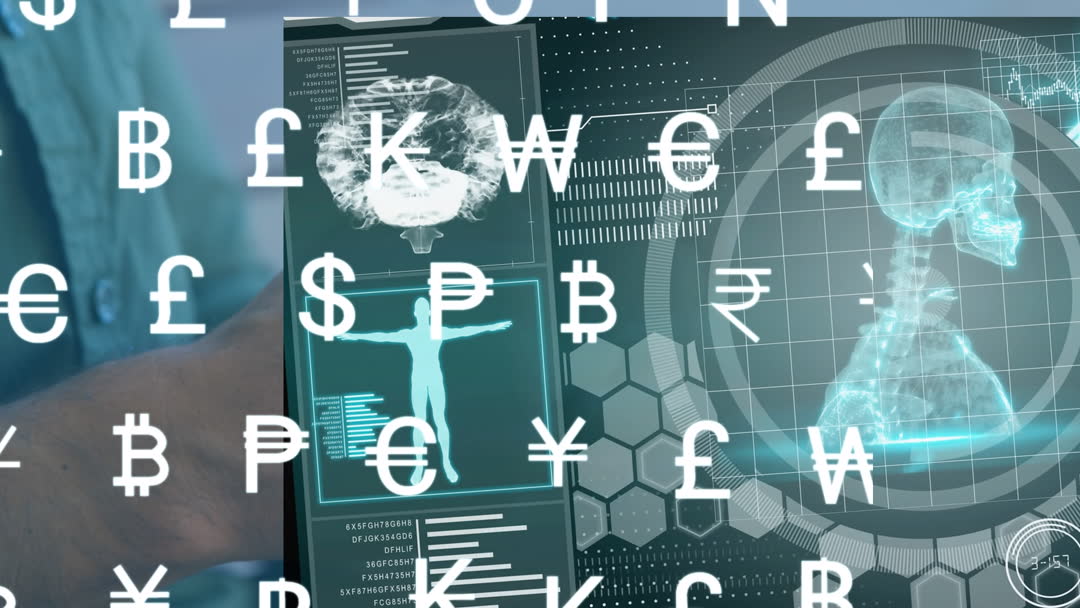 This video depicts the innovative use of technology to connect financial data with human interaction. Various currency symbols overlay a digital interface illustrating how global business evolves through advanced technological methods. This concept can be used to represent topics on the future of economics, digital transactions, science, and the integration of technology in day-to-day lives.