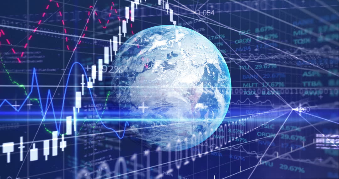 Depicts digital financial landscape featuring Earth surrounded by financial data and binary codes. Symbolizes worldwide finance, high-tech economy, and interconnected markets. Useful for finance industry promotion, global economic documentaries, technology conferences, and multinational business presentations.