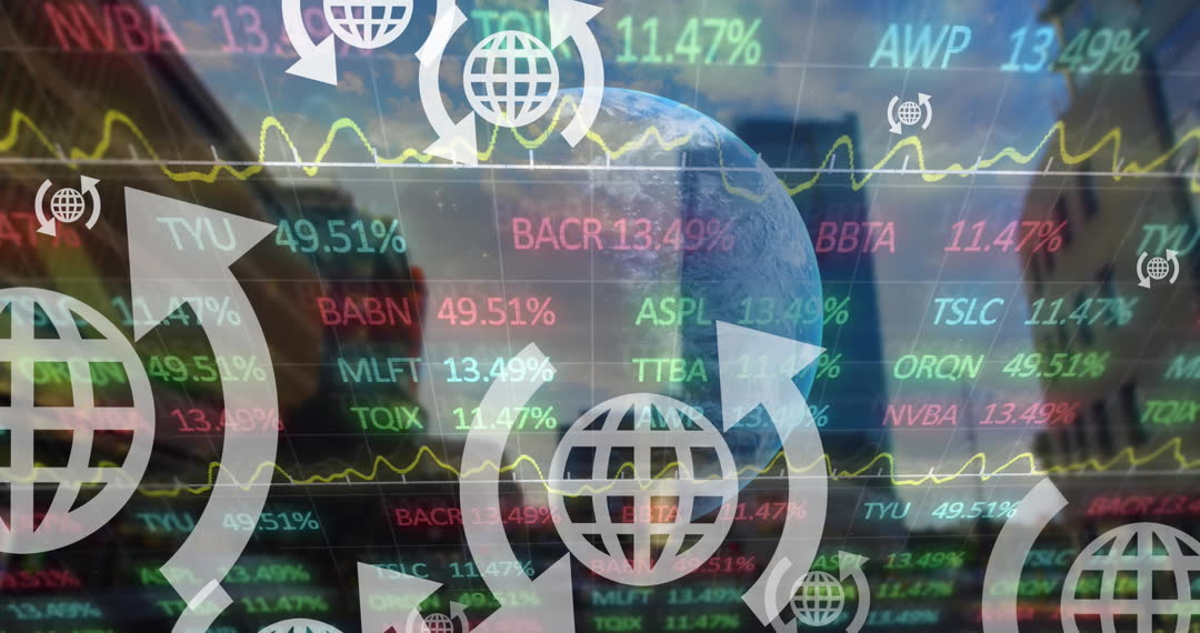 Animation of vibrant financial data overlays alongside network and globe icons set against a cityscape background. Numbers and graphs indicative of stock market or financial analysis are prominent. Use this for illustrating global business, data analytics, stock market insights, or finance presentations and educational content.