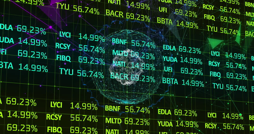 Dynamic visual of financial data processing on a digital globe with interconnected points. Ideal for illustrating global finance concepts, data analytics, stock market information, technological investment strategies, and business technology presentations.