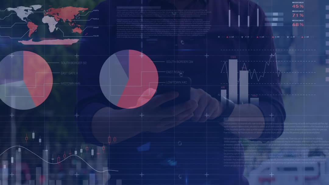 A businessman interacts with his smartphone against a backdrop of dynamic, overlapping financial data visualizations and charts. This video showcases themes of global finance technology and advancements in digital financial analytics. It can be used in contexts related to finance technology solutions, data analytics consulting, global economic reports, or corporate financial strategy.