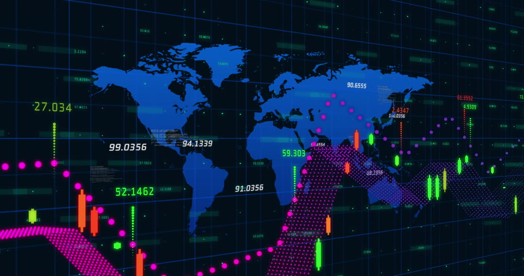 Visualizes global financial trends using a digitally generated world map interface with dynamic graphs and data points. Ideal for presentations on financial technology, global business networks, data analysis, digital market studies, and educational purposes related to global economic patterns.