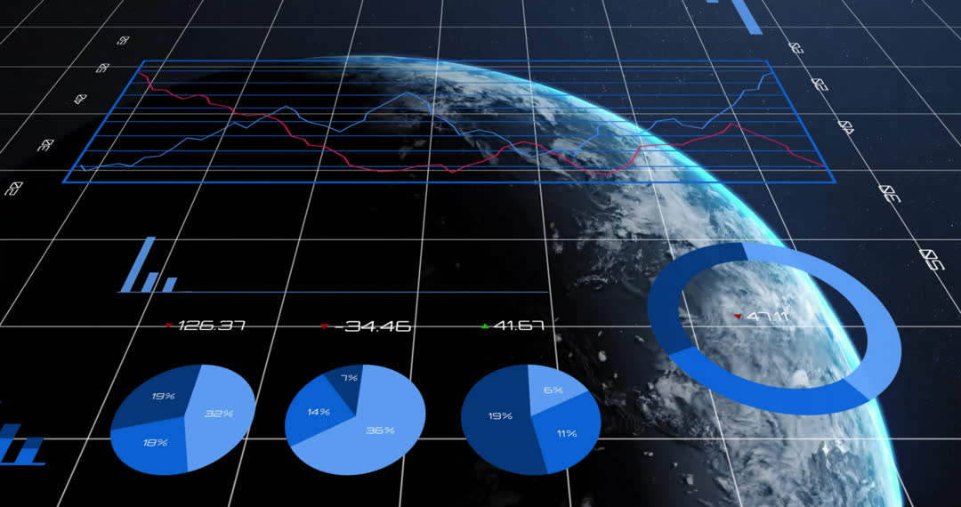 Digital representation of financial data charts overlayed on an video of Earth, conveying a sense of global financial processes and technological interactions. Useful for financial reports, presentations, and websites focusing on global economics or data analytics advancements.