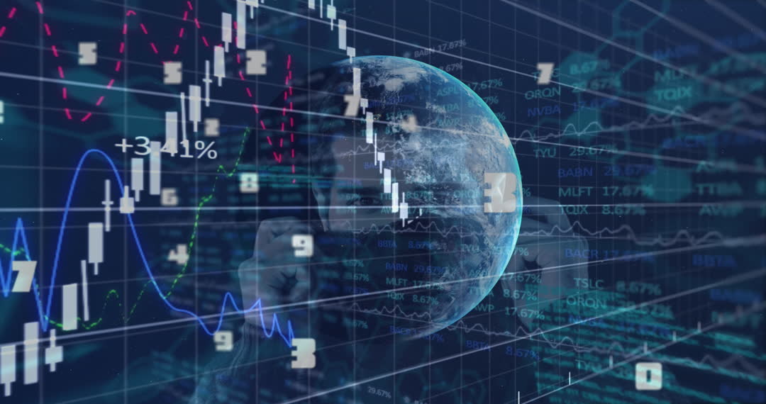 Digitally illustrated showcase of financial data against an animated globe backdrop encapsulating the themes of global market trends. Suitable for use in presentations about global economy, stock market analysis, or emerging financial technologies.
