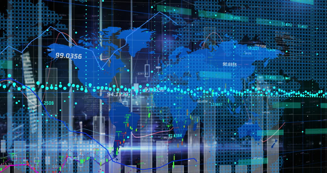 Illustrates global finance and economy concepts with an abstract visual of a world map overlayed by fluctuating graphs and numerical data. Useful for presentations on economics, articles related to global markets or educational resources explaining financial statistics.