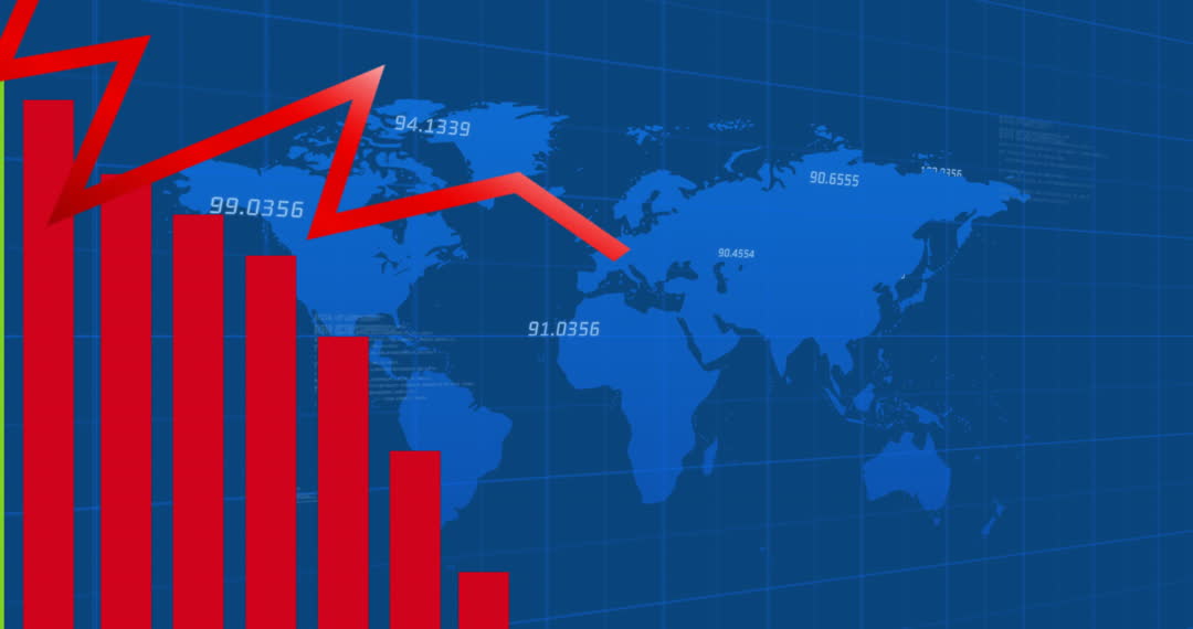 Financial data visualization displaying upward and downward graph lines over a global map background. Ideal for illustrating economic trends, market analysis or global financial reviews in presentations and reports.