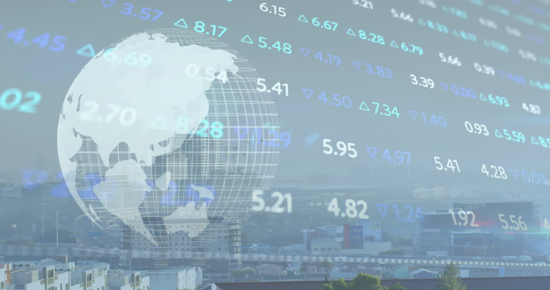 Abstract video depicting stock market data and world map blend over cityscape, symbolizing the interconnectedness of global finance and economics. Useful for financial news articles, investment firm websites, and business technology blogs.