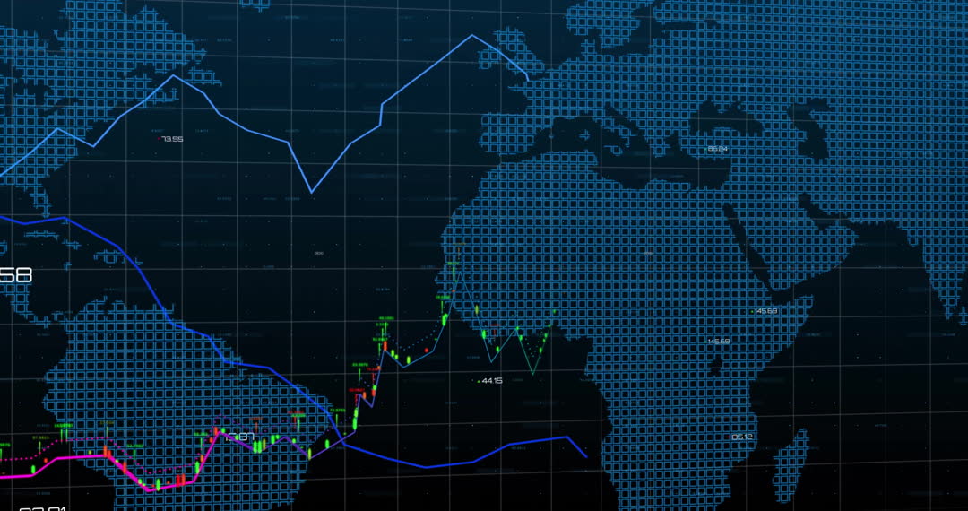 Animated visualization of financial data displayed over a digital world map, ideal for presentations related to global financial trends, market statistics, and economic analysis. Useful for business reports, educational content, or financial news segments discussing international market movements and investment insights.
