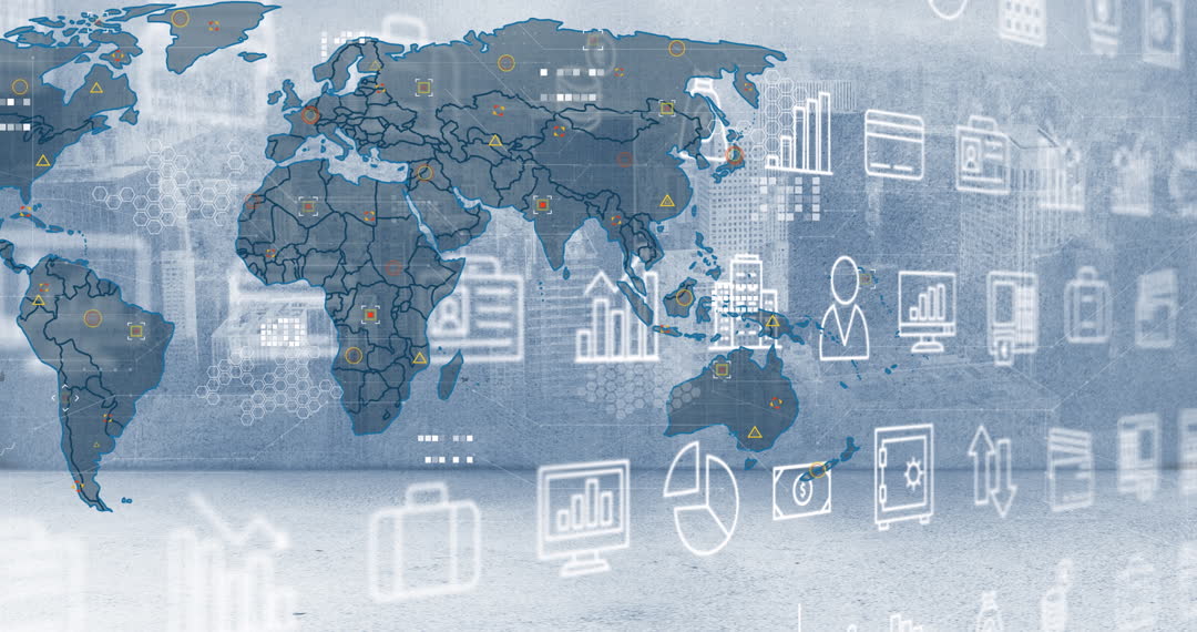 Abstract visualization of global finance featuring world map overlay with icons representing various financial metrics and cityscape in the background. Captures essence of international business and modern economic exchange networks. Ideal for use in content focused on global economy, digital finance, corporate presentations, and networking visualizations.