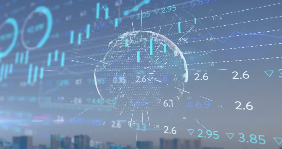 Image depicts an abstract overlay of financial graphs and a digital globe on a city skyline, symbolizing the modern intersection of finance and technology. It highlights global business dynamics, market analytics, and economic indicators, making it suitable for presentations on finance innovations, digital trading systems, and economic forecast reports.