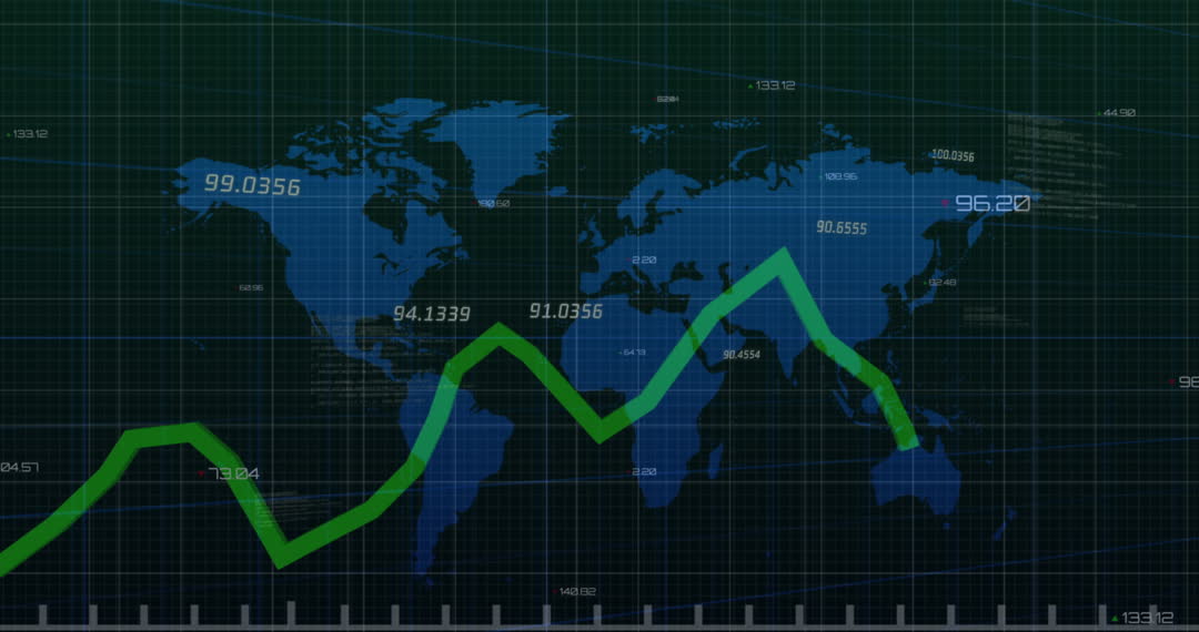 Graphic showing a world map overlaid with financial data metrics, indicating global market trends. Useful for presentations, reports, and articles on international finance, economics, and digital analysis tools.