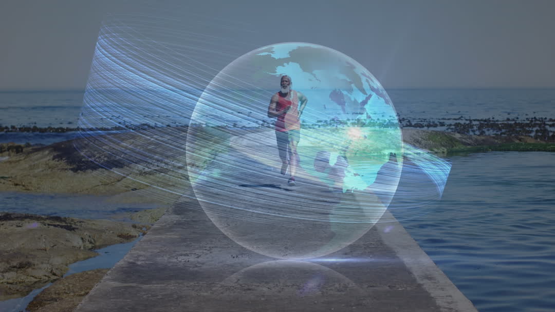 - Global Fitness Connection: Man Running by Ocean Pathway with Digital Overlay
