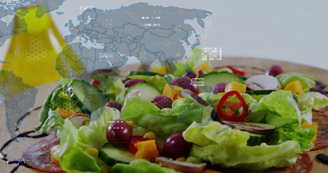 Video showing camera focusing on fresh mixed greens and colorful vegetables on wooden plate while world map overlay animating across frame. HUD nodes and connecting lines pulsing to indicate ingredient origins and supply routes, creating clear visual linking farm regions to plate. Visual style combining close-up food cinematography with modern tech graphics and cool map blues layered over warm food tones. Motion elements include subtle camera push, HUD data popups, and animated origin markers that can be timed to match narration or music. Use cases include food provenance storytelling, farm-to-table marketing, restaurant websites, menu background loops, agritech demos, blockchain traceability presentations, news segments about global food supply, healthy eating campaigns, social media clips, and educational material about sourcing. Video works well as opener for corporate presentations, overlay for infographic explainer, or background visual for digital signage and trade show displays.