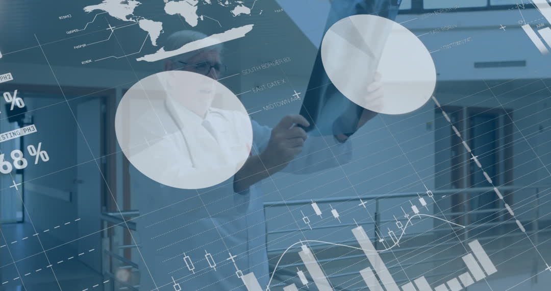 A doctor examines medical results with overlaid financial graphs and world map visuals, symbolizing the intersection of healthcare and business analytics. This illustration is useful for articles, presentations, and multimedia projects exploring innovative healthcare solutions, data-driven medicine, and the role of technology in medical decision-making.