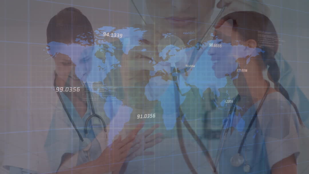 This video depicts a global healthcare concept with medical professionals. With overlay of a world map and numerical data, it signifies the integration of technology and medicine around the world. Useful for illustrating themes in digital health innovation, international healthcare strategies, and the advancement of medical technology.