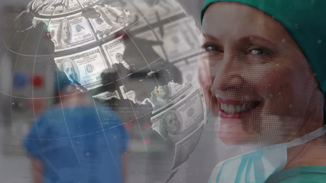 Visual shows a smiling female surgeon alongside futuristic graphics suggesting global finance in healthcare through dollar bills on a globe and digital elements. Ideal for content on healthcare economies, innovative financial solutions in the medical field, and the integration of digital technology in global health services.