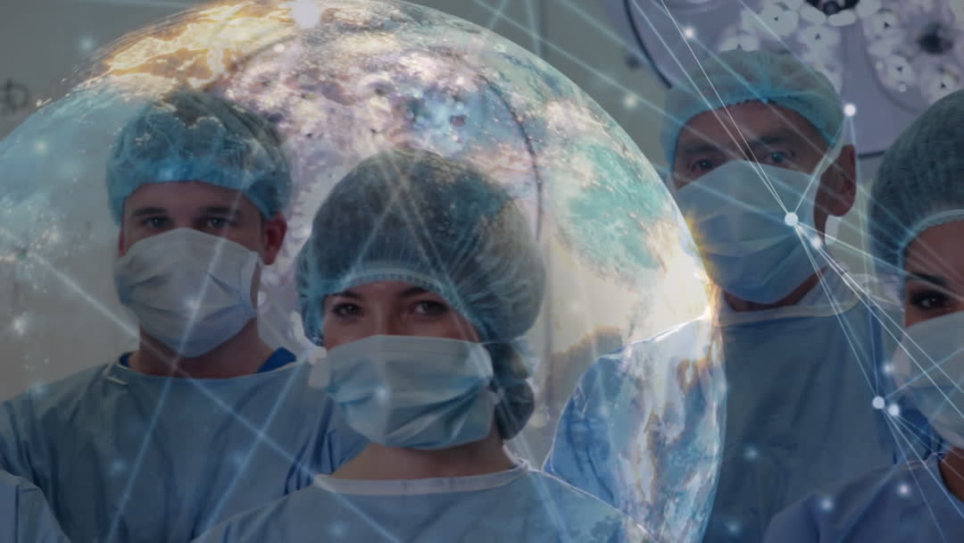 Image of healthcare professionals wearing protective masks and caps overlayed with a digital globe and network lines. Useful for illustrating the global coordination and connectivity of medical professionals during the Coronavirus pandemic. Perfect for articles on worldwide healthcare collaboration, COVID-19 response strategies, and international medical support systems.