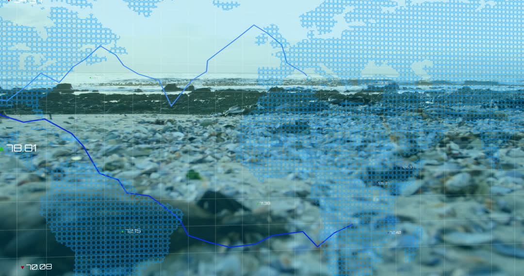 A composite video showing stacked graphs and a world map over littered beach scene highlights the intersection of economic trends and environmental issues. Useful for topics involving pollution, finance, global economy, environmental conservation, and corporate responsibility. Ideal for educational materials, business presentations, or articles illustrating environmental impacts on economics.