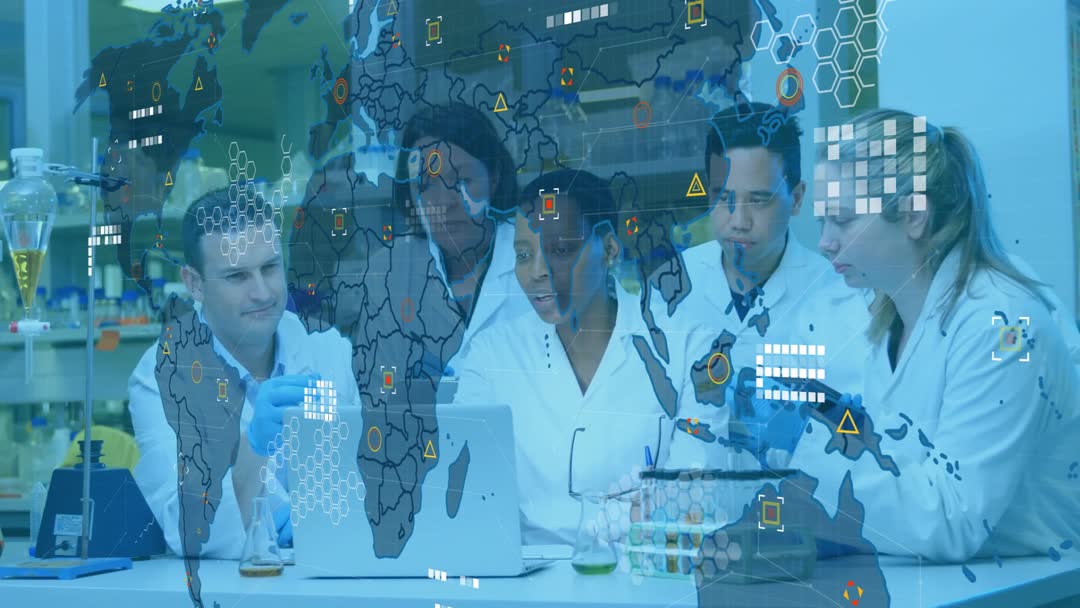 Scientists in laboratory reviewing data on digital world map, showcasing connection between technology and research, depicting global collaboration and scientific advancement. Ideal for content on innovation, scientific method, technology in research, global tracking, and teamwork in science fields.