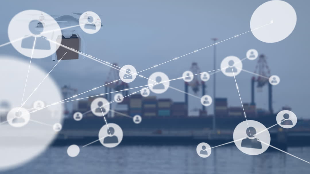 Illustrates the modern integration of drone technology with global logistics and shipping via digital networks. Suitable for articles or presentations discussing advancements in supply chain technology, international trade, and innovative delivery solutions.
