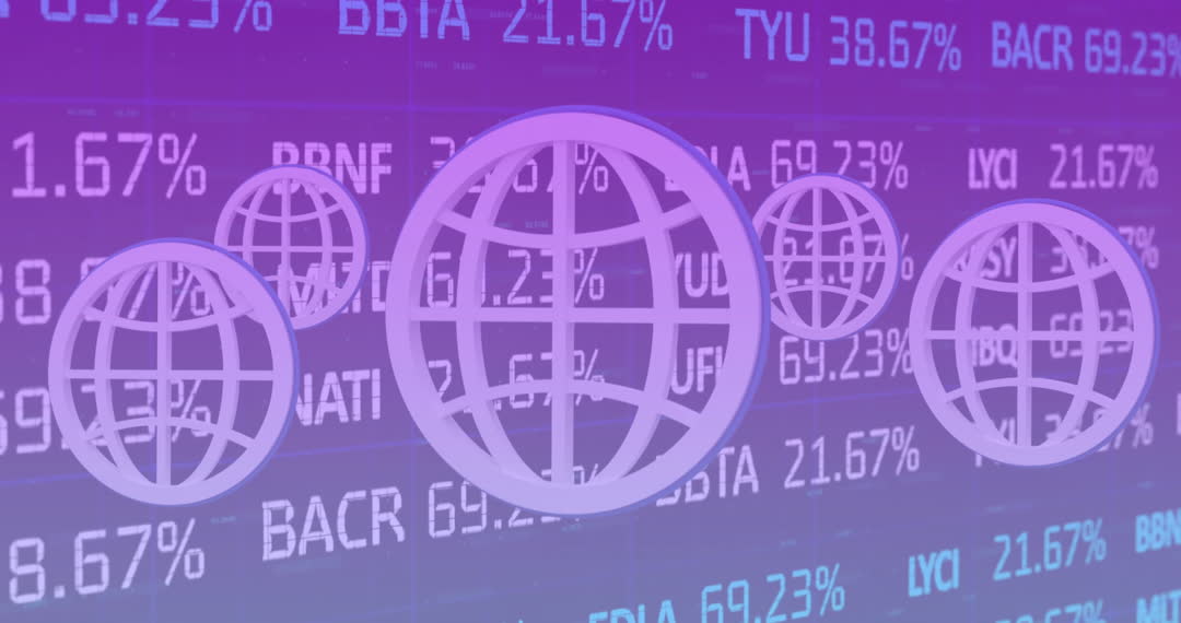 Colorful animation illustrating global business and finance concepts. Features rotating globe icons over financial data, ideal for businesses, presentations, and educational purposes focused on economics or international trade. Effective for a dynamic backdrop in financial services marketing or audience engagement in technology-driven presentations.