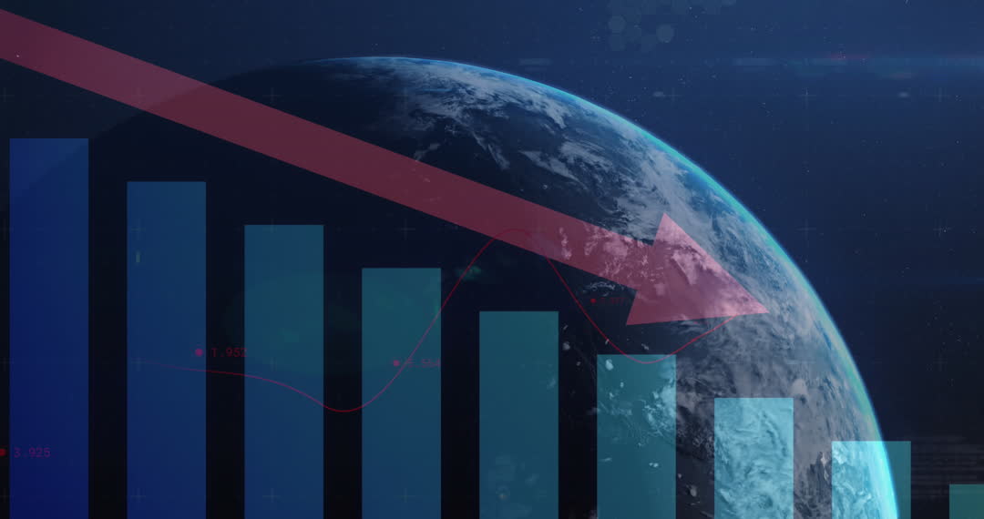 Depicts a comprehensive view of market fluctuations with a visual representation of a downward trend superimposed on an video of Earth. Ideal for presentations, reports, or articles focusing on global economic challenges or financial analytics. Engages audiences in discussing the impact of global phenomena on markets.