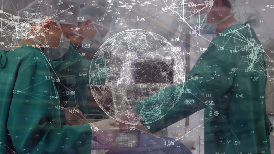 A surgery scene overlaid with a globe and network connections illustrates the fusion of technology and healthcare. It symbolizes global communication, enabling advancements in medical procedures and data sharing across the world. Useful for media and presentations on telemedicine, global health innovation, and cross-border medical collaboration.