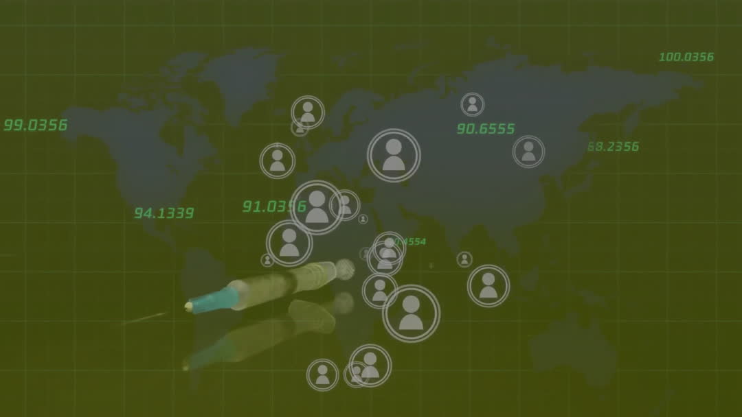 Illustrates intersection of medical technology with global datasets, emphasizing worldwide healthcare and pandemic management. Useful for presentations on medical advancements, global health trends, or pharmaceutical innovation.