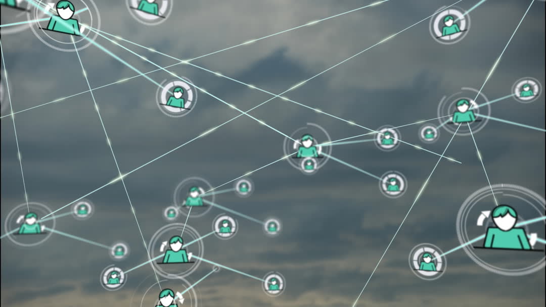 Digital animation illustrating interconnected network of profile icons against dark cloudy sky. Ideal for visualizing global connectivity, online business communication, or cloud technology. Useful for presentations, websites focusing on tech-related content surrounding global networks or communication platforms.