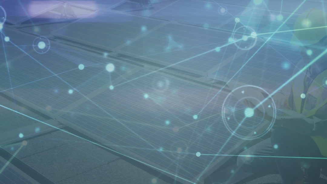 Animated digital connections overlay focused on a worker operating solar panels, conveying a sense of modern technology and innovation in renewable energy fields. Suitable for use in presentations or advertising sustainable energy solutions and technology advancements.