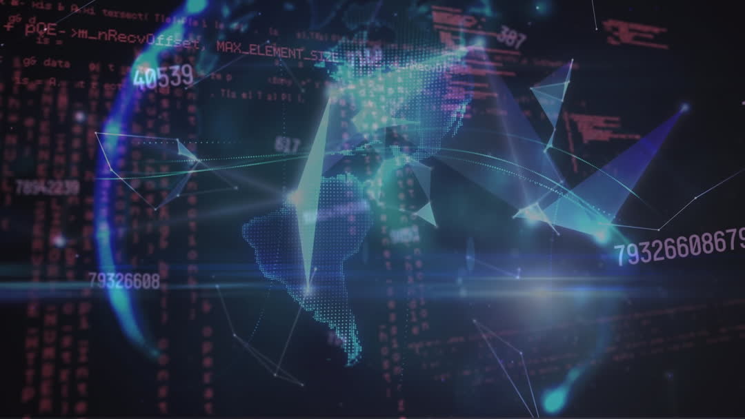 The visual depicts a dynamic and futuristic representation of a global network concept, illustrating data processing and worldwide connections through animation of digital numbers and videory of network lines. This can be utilized in presentations related to technology, digital transformation, big data analysis, and global communication systems. Ideal for articles and content around tech-space innovations and data-driven insights.