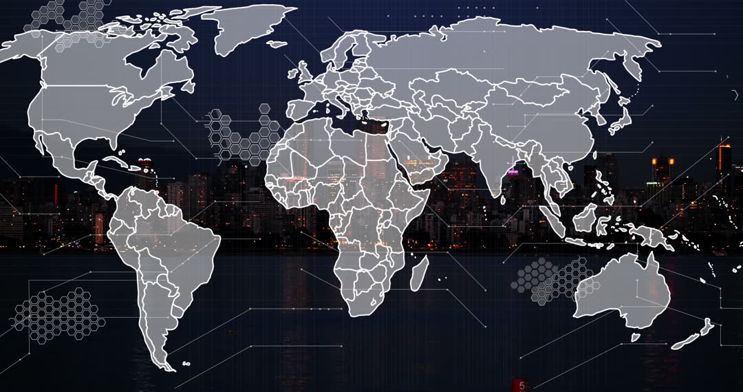 Image featuring digital connections overlaying a world map with an urban skyline in the background. This visual representation suggests concepts of global business, digital communication, and international networking. Ideal for use in presentations on global technology trends, digital interfaces, or international commerce.