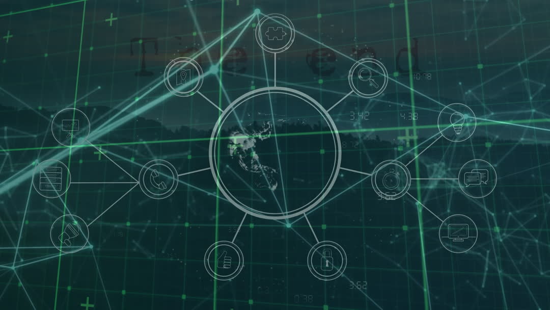 This visual depicts an abstract network of connections with various icons over a landscape background, emphasizing global connectivity and digital data processing. The animated digital grid suggests technology partnerships and the flow of information around the world. Ideal for use in presentations about global communication, data networking, international business strategies, or technology infrastructure.