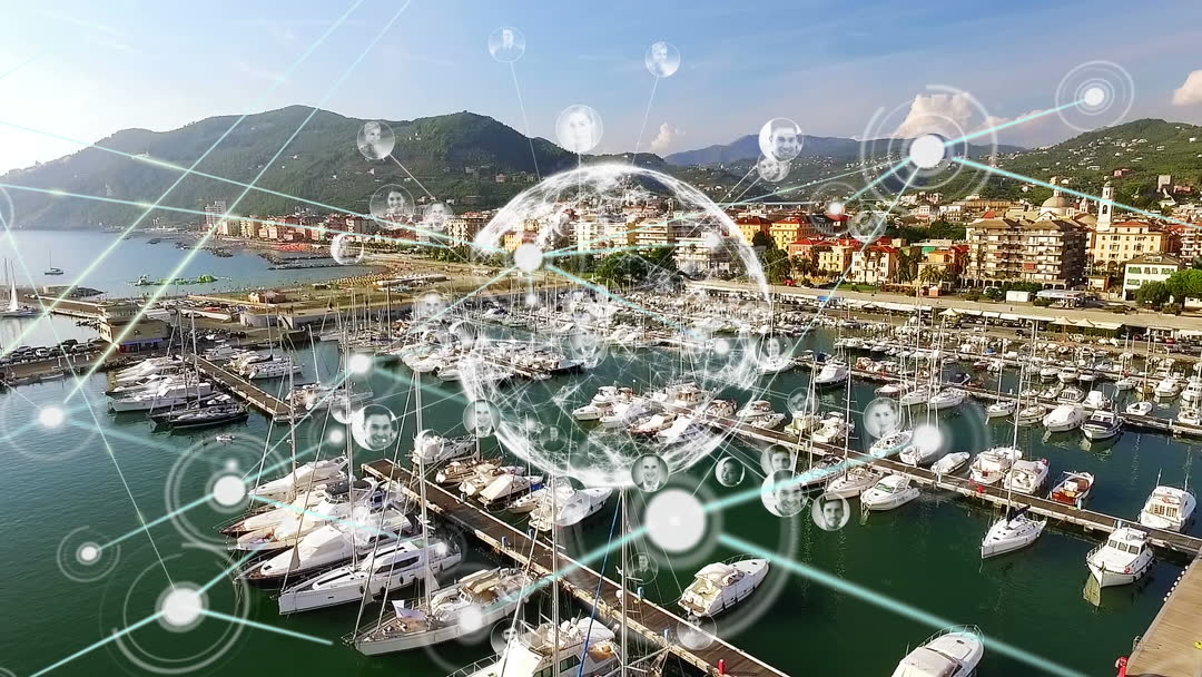 Overlay of digital connections across a marina scene symbolizes global communication and logistics. Useful for projects on global business, trade or connectivity enhancing modern transportation, illustrating sophisticated network systems in enterprises.