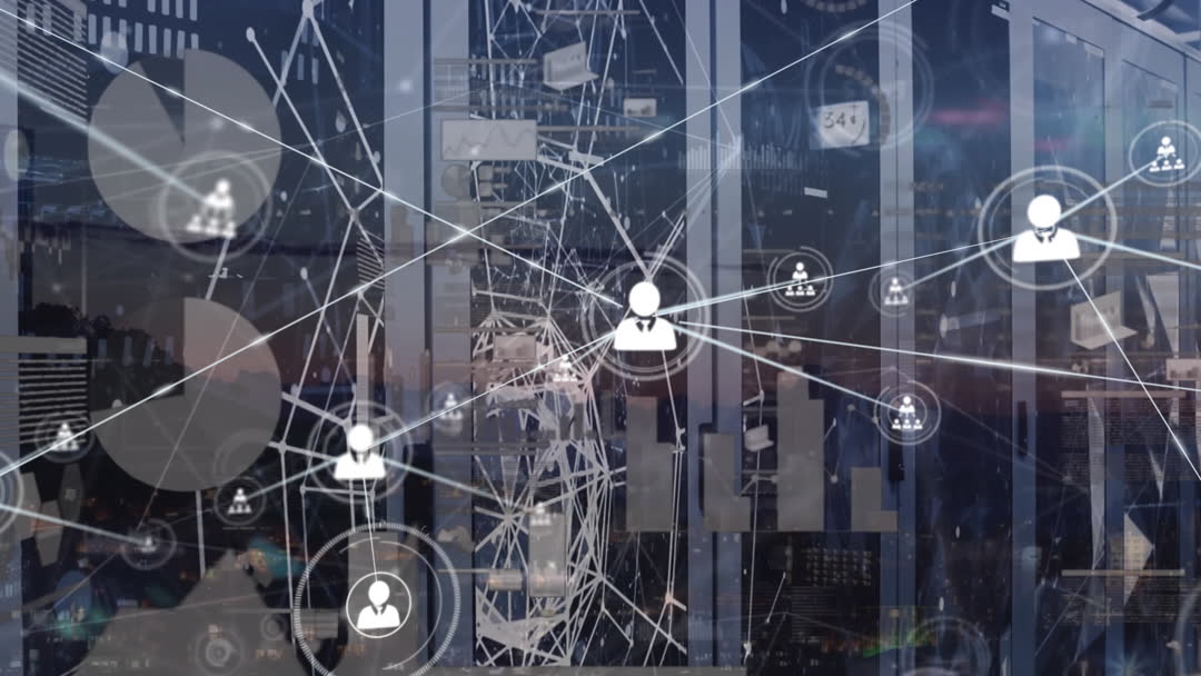 The video depicts a complex web of icons and lines symbolizing network connections overlaying a server room, representing global data interaction and communication. An ideal visual for illustrating concepts in information technology, digital network conferences, and data management programs. Suitable for use in tech-related presentations, network security seminars, or online articles about modern data exchange systems.