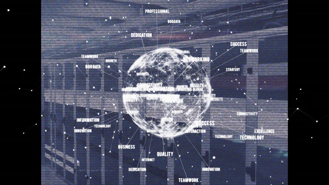 Digital animation showcases a globe surrounded by network connections indicating data and technology. Concepts such as business, IT strategies, and innovation are intertwined. Useful for presentations on digital transformation, technology networks, and business strategy discussions.