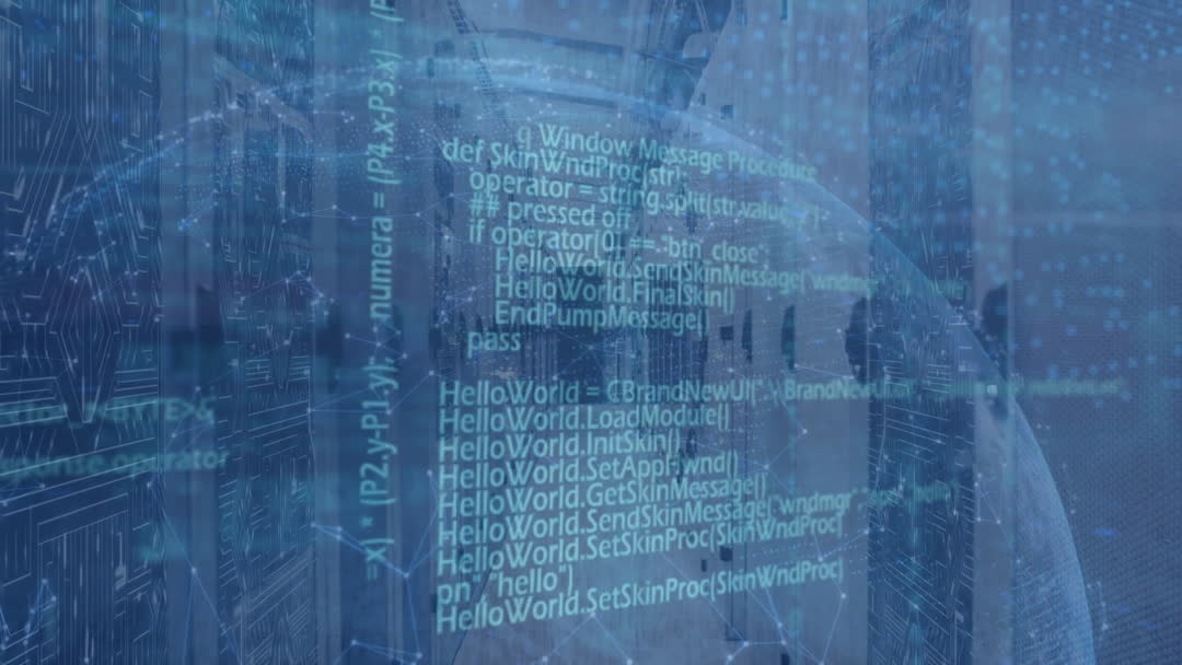 This video illustrates global network connections with an overlay of computer code, symbolizing cybersecurity and data processing in server rooms. It is ideal for technology-related articles, cybersecurity projects, presentations on data storage systems, and educational materials on information technology.